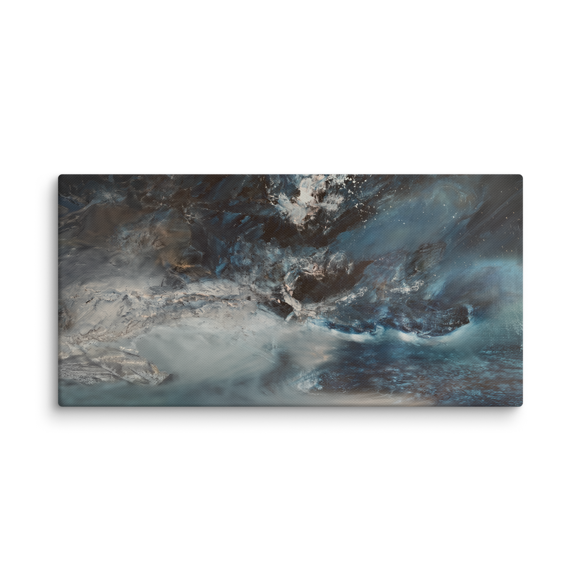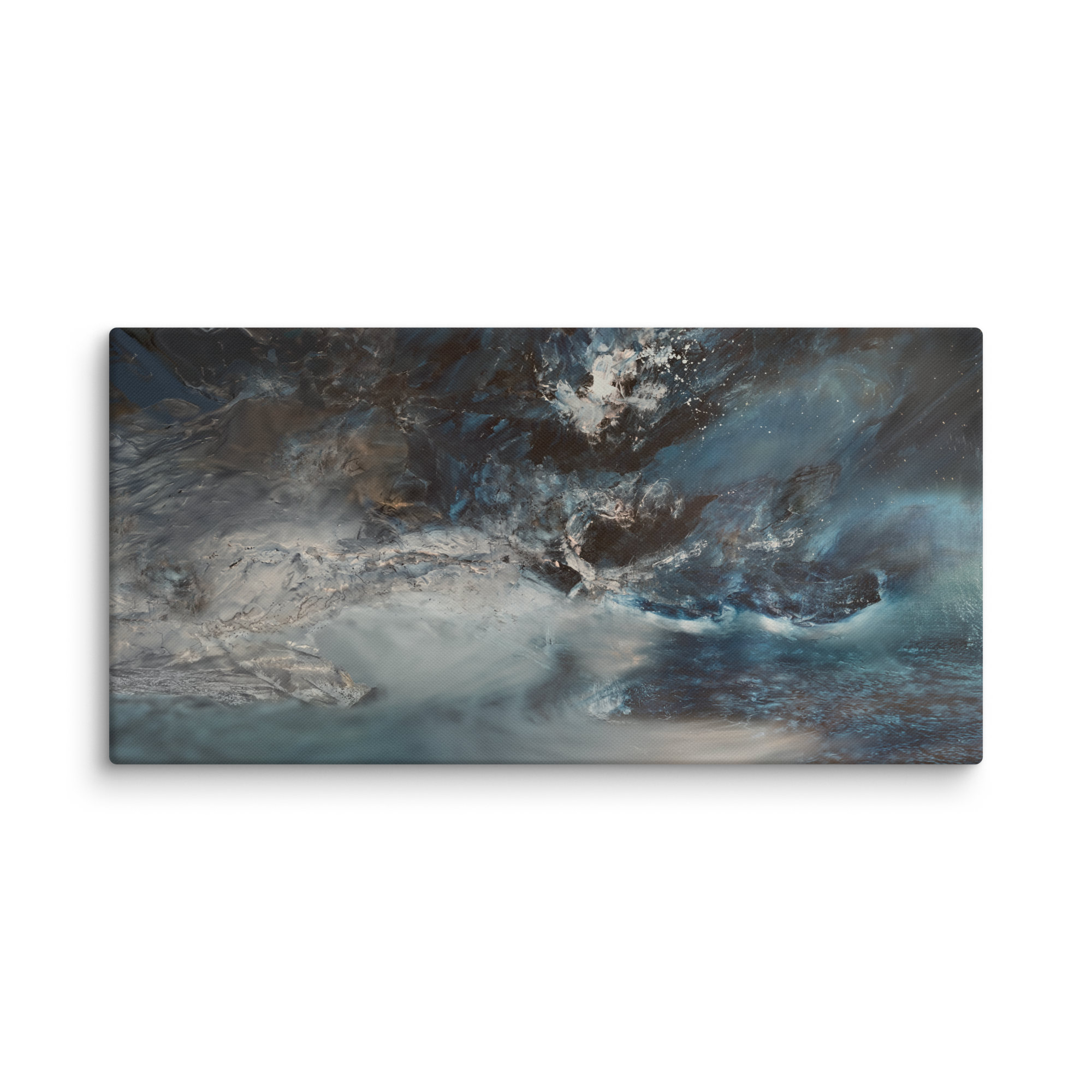 Ligne de passage est une œuvre contemporaine aux tonalités bleutées et minérales, traversée par un mouvement horizontal continu.